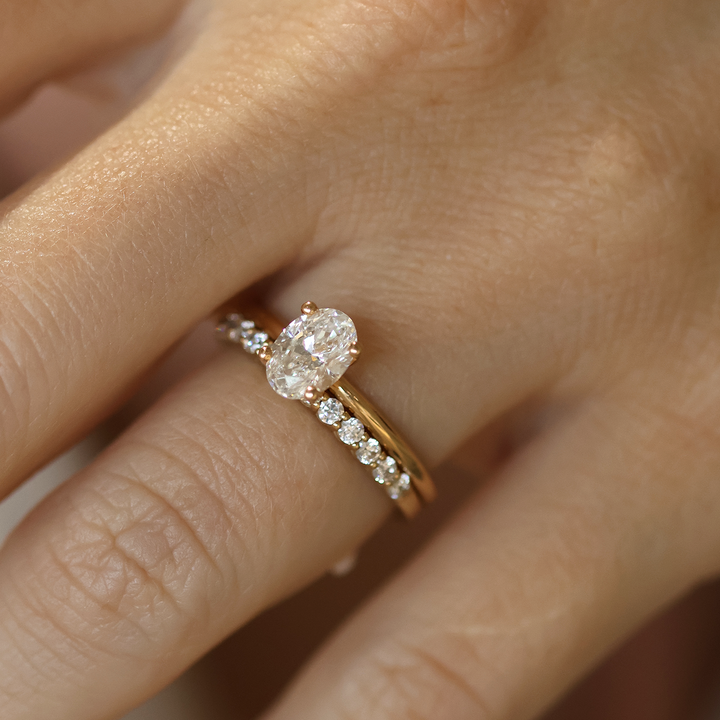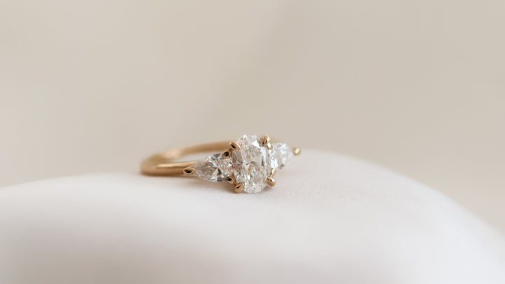 Ringen pryds av två omsorgsfullt utvalda diamanter, en Oval cut och en Pear Cut placerade sida vid sida i en elegant asymmetrisk fattning på en mjuk och nätt helrund ringskena.